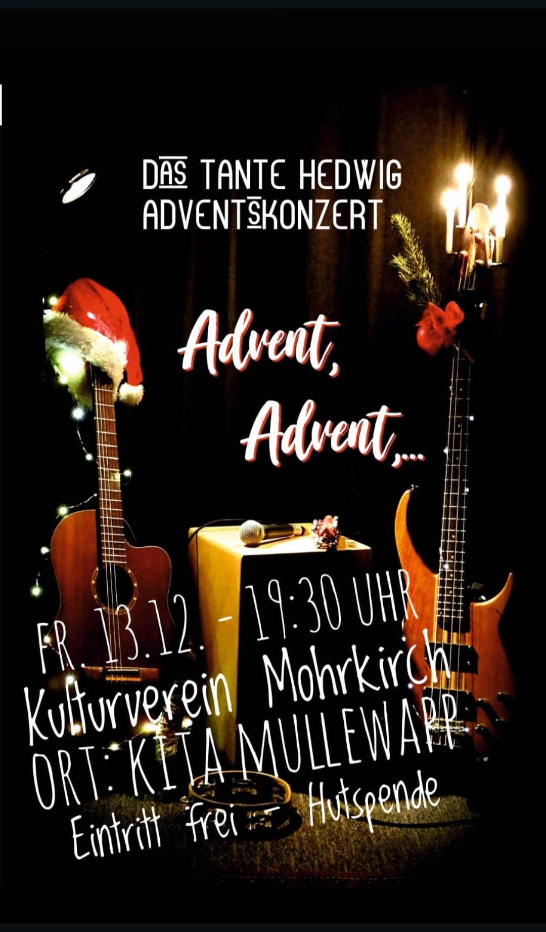 Auch in diesem Jahr spielt die Band „Tante Hedwig“, bestehend aus Thomas Johannsen, Piet Jensen und Volker Carstens, ihr Adventskonzert für uns. Es findet statt am Freitag, d. 13.12.2024 in der KITA Mohrkirch, Schulstr. 8, Einlass: 19.00 Uhr, Beginn: 19.30 Uhr.