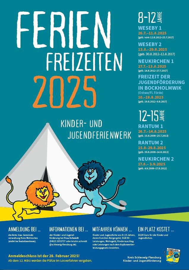 Familien können unter bestimmten Voraussetzungen für Ihre Kinder einen stark verbilligten Platz in einem der Zeltlager in Weseby und Rantum bekommen. Weitere Informationen finden Sie auf dem Plakat und im Anhang "Informationen".