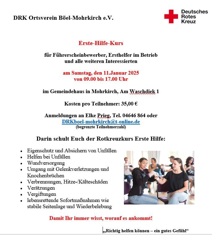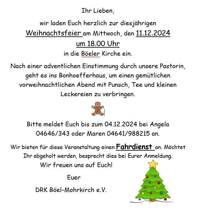 wir laden Euch herzlich zur diesjährigen Weihnachtsfeier am Mittwoch, den 11.12.2024 um 18.00 Uhr in die Böeler Kirche ein. Nach einer adventlichen Einstimmung durch unsere Pastorin, geht es ins Bonhoefferhaus, um einen gemütlichen vorweihnachtlichen Abend mit Punsch, Tee und kleinen Leckereien zu verbringen. Bitte meldet Euch bis zum 04.12.2024 bei Angela 04646/343 oder Maren 04641/988215 an. Wir bieten für diese Veranstaltung einen Fahrdienst an. Möchtet Ihr abgeholt werden, besprecht dies bei Eurer Anmeldung.