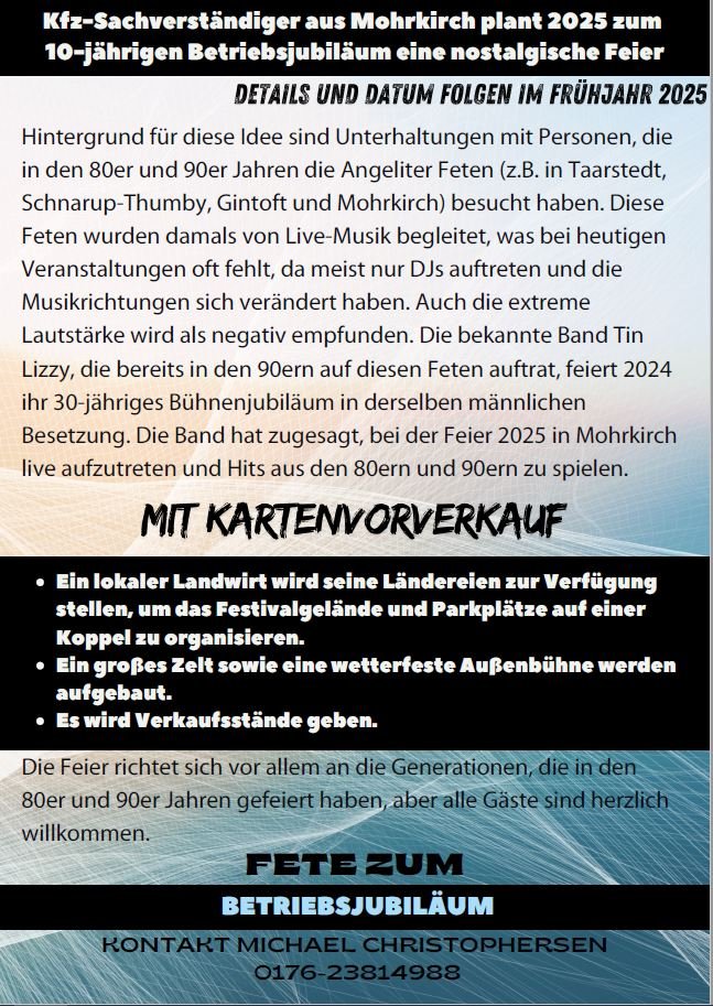 Auch in diesem Jahr spielt die Band „Tante Hedwig“, bestehend aus Thomas Johannsen, Piet Jensen und Volker Carstens, ihr Adventskonzert für uns. Es findet statt am Freitag, d. 13.12.2024 in der KITA Mohrkirch, Schulstr. 8, Einlass: 19.00 Uhr, Beginn: 19.30 Uhr.