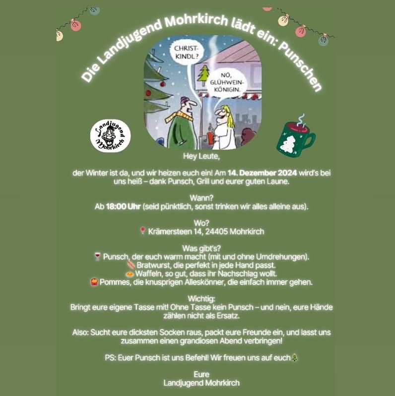 Wie bereits angekündigt lädt der Kulturverein Mohrkirch am Freitag, den 13.12. zu einem musikalischen Adventsabend um 19.30 Uhr in die Kita Mohrkirch ein. Die dreiköpfige Band "Tante Hedwig" gibt ein Adventskonzert. Die Landjugend freut sich am Samstag über viele Gäste. Ab 18.00 gibt es am Landjugendhaus, Krämersteen 14, wieder Punsch, Grillwurst und andere Leckereien. Für eine weihnachtliche Stimmung wird seit Tagen das Gelände weihnachtlich geschmückt.