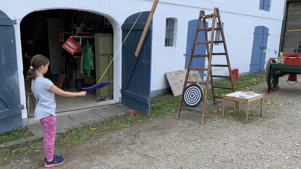 Auf dem „Schulhof“ vor dem Museum konnte man sein Glück versuchen mit dem „fliegenden Fisch“ eine Zielscheibe zu treffen. Manch einer erinnerte sich auch an Gummitwist und Hinkepott.