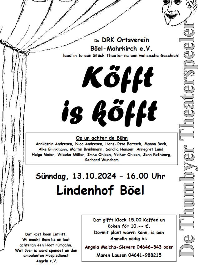 Das DRK Böel-Mohrkirch und die Thumbyer Theaterspeelers haben gemeinsam in den Lindenhof nach Böel eingeladen. Auf dem Programm stand das plattdeutsche Stück „Köfft is köfft“. Nach einer leckeren Kaffeerunde war der Saal nahezu bis auf den letzten Platz besetzt. Das Stück spielt um 1900 und handelt von Situationen im Dorfkrug, den Folgen, der Neugier und einer klugen Ehefrau. Die Schauspieler begeisterten das Publikum mit viel Spaß, Engagement und Leidenschaft und ernteten viel Applaus. Im Anschluss wurde um eine Hutspende für den Hospizdienst Angeln gebeten.