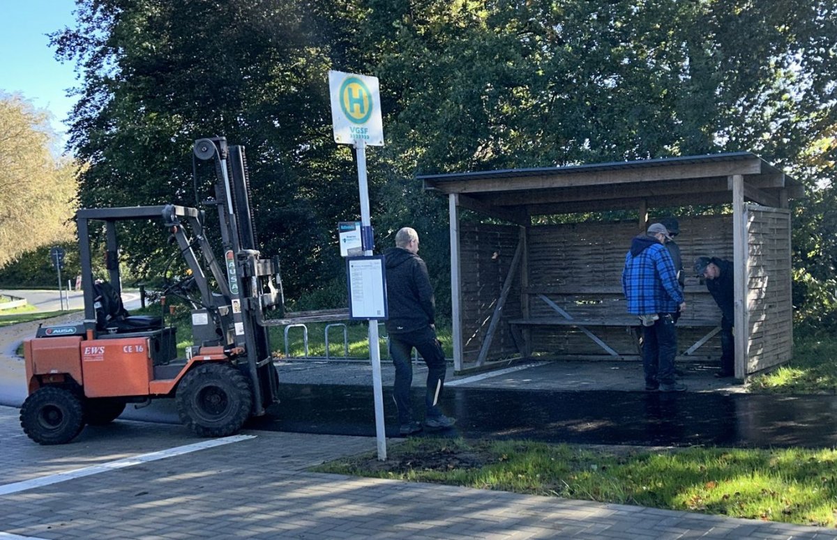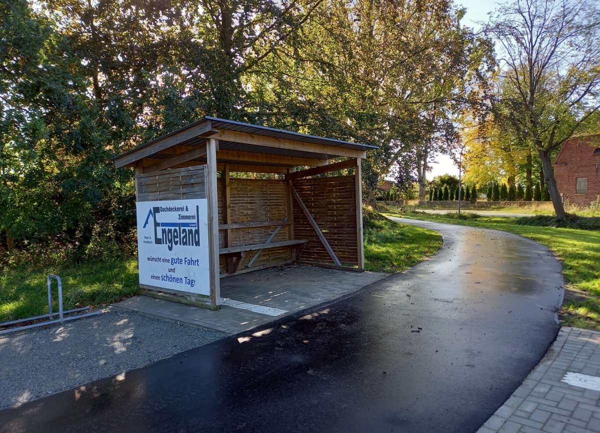Die neue Bushaltestelle an der Kita hat jetzt ein Wartehäuschen. Das von Fa. Engeland gespendete Häuschen ist schon zweimal umgezogen und steht jetzt an seinem endgültigen Platz. In den nächsten Tagen wird noch eine Beleuchtung installiert.