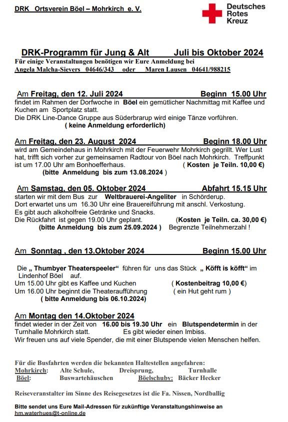 - Am Sonntag, den 13. Oktober 2024, spielen die Thumbyer Theaterspeeler im Lindenhof in Böel für uns. Auf dem Programm steht das Stück „Köfft is köfft“. Vorher gibt es um 15.00 Uhr Kaffee und Kuchen für 10,00 € pro Person und um 16.00 Uhr beginnt die Aufführung. Bitte meldet Euch bis zum 06.10.2025 bei Angela 04646/343 oder Maren 04641/988215 an.