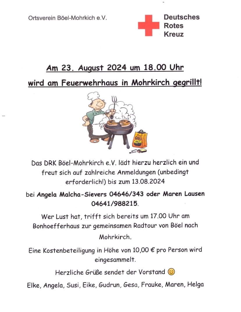 Das DRK Böel-Mohrkirch e.V. hatte zu einem Grillabend ans Gemeindehaus in Mohrkirch eingeladen. Anfangs fegte ausgerechnet an diesem Tag ein leichter Sommersturm über Angeln. Doch diesem zum Trotz waren 60 Mitglieder nach Mohrkirch gekommen, um zu schnacken, lecker zu essen und zu trinken und die dörfliche Geselligkeit zu genießen. Die Freiwillige Feuerwehr hat das Grillen übernommen und dafür gesorgt, dass alle mit Köstlichkeiten versorgt wurden.
