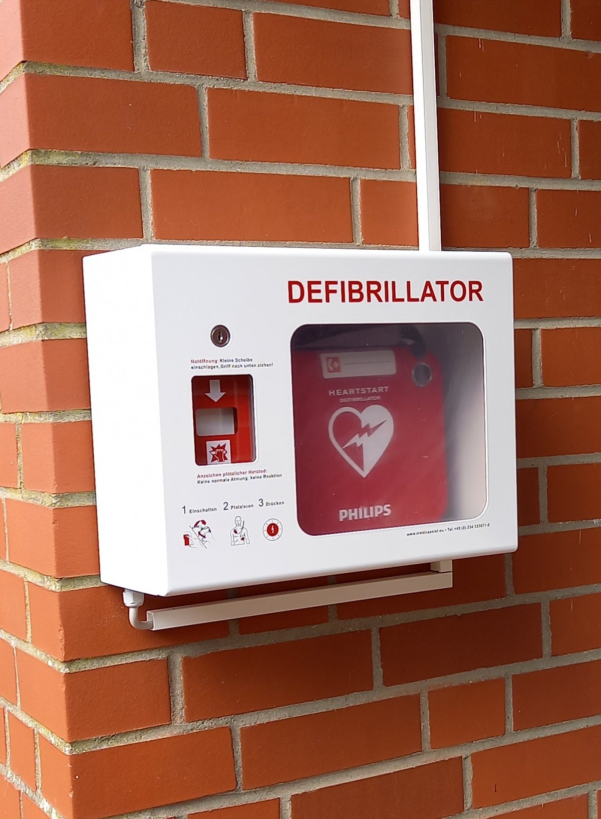 Außen am Eingang zur Sporthalle haben wir einen Automatischen externen Defibrillator AED stationiert..