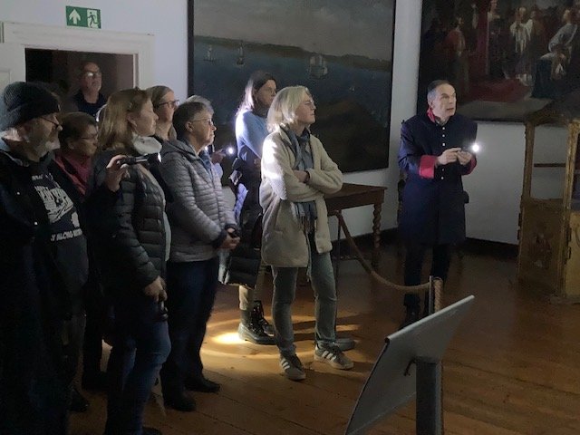 Einen Ausflug der besonderen Art unternahmen wir mit dem DRK Böel- Mohrkirch in diesen Herbsttagen. „Nachts im Schloss“ war das Motto, unter dem unsere Gruppe mit 24 Teilnehmern zur Besichtigung IM Glücksburger Schloss angemeldet war. Beim Klopfen ans Hauptportal zur abendlichen Stunde, wurde uns gleich von drei „Schlossangestellten“ das Tor geöffnet und wir wurden auf besondere Weise hereingebeten. Schummeriges Licht flackerte nicht nur im Eingangsbereich. Da sich dies auch in den anderen Räumen nicht änderte, wurden wir alle mit Taschenlampen ausgestattet.