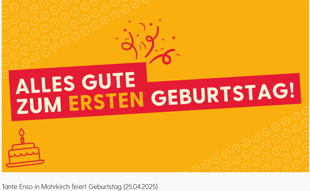Vom Konfetti herrscht mittlerweile keine Spur mehr, aber die Nachbarn kommen immer noch vorbei, um in ihrer Filiale den Einkauf zu tätigen. Die Würstchen werden anlässlich des ersten Geburtstags aber wieder von der Feuerwehr auf dem Grill gedreht. Merkt euch also das Datum: Am 25. April findet in eurer Tante Enso-Filiale eine kleine Feier statt. Im Tante Enso verlost euer Filialteam am Glücksrad Geschenke und ab 16 Uhr grillt draußen die Feuerwehr – Getränke werden von der Landjugend verteilt.