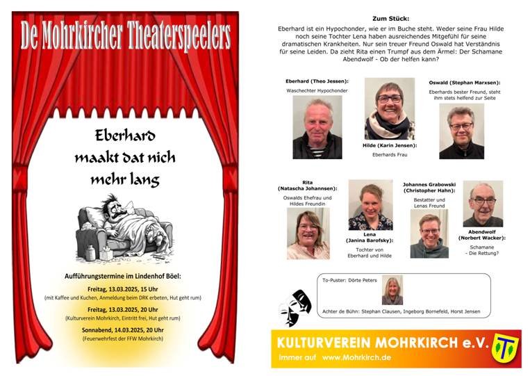 Die Theater Saison geht wieder los. Die Mohrkircher Theoderspeelers sind in vielen Orten in Angeln unterwegs und spielen ihr neues Stück. Am kommenden Wochenende sind es gleich drei Aufführungen in Böel: das DRK Böel-Mohrkirch lädt am Freitag um 15.oo Uhr mit Kaffee und Kuchen (Anmeldung bei Angela 04646/343 oder Maren 04641/988215), der Kulturverein am Freitag um 20.00 Uhr und die Feuerwehr am Samstag um 20.00 Uhr ein.