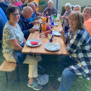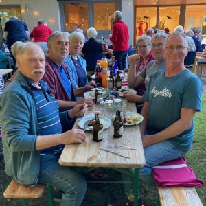 Der Abend startete für einige der Teilnehmer mit einer Radtour von Mohrkirch nach Böel, bei der auch die Fahrradfahrer auf ihre Kosten kamen. Am Bonhoefferhaus angekommen, gab es das erste Getränk und die Feuerwehr Böel hatte schon dafür gesorgt, dass ausreichend Gegrilltes vorrätig war. Das Buffet wurde eröffnet und nun konnte ordentlich geschlemmt werden.