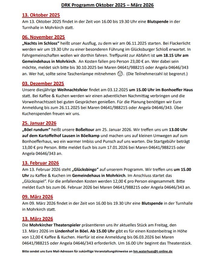 Das DRK Böel-Mohrkirch organisert halbjährlich ein vielfältiges Programm. Möchtest du das aktuelle Programm per Mail bekommen, dann schicke eine Mail an hmwaterhues_at_t-online.de